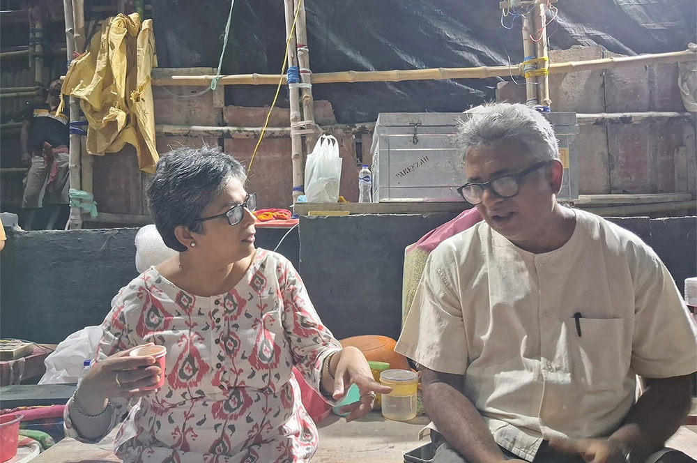 The invitation was long-standing; the intention, longer still. It finally happened on a quiet winter morning -- my first visit to 'Chander Haat'. Operating out of a beautiful space in Sarsuna, it's an art collective that believes in and encourages interdisciplinary and community-based art practice. Founded in 2008, its members include Tarun Dey, Bhabatosh Sutar, Mallika Das Sutar, Pradip Das, Pintu Sikdar, Nirmal Malick and Anjan Das. I could meet only the artist-couple in this collective during my visit earlier this week, apart from Pradip (who showed me around), and got introduced to one of their friends (Sujay Das).